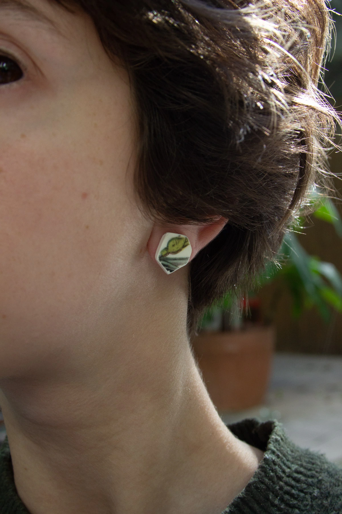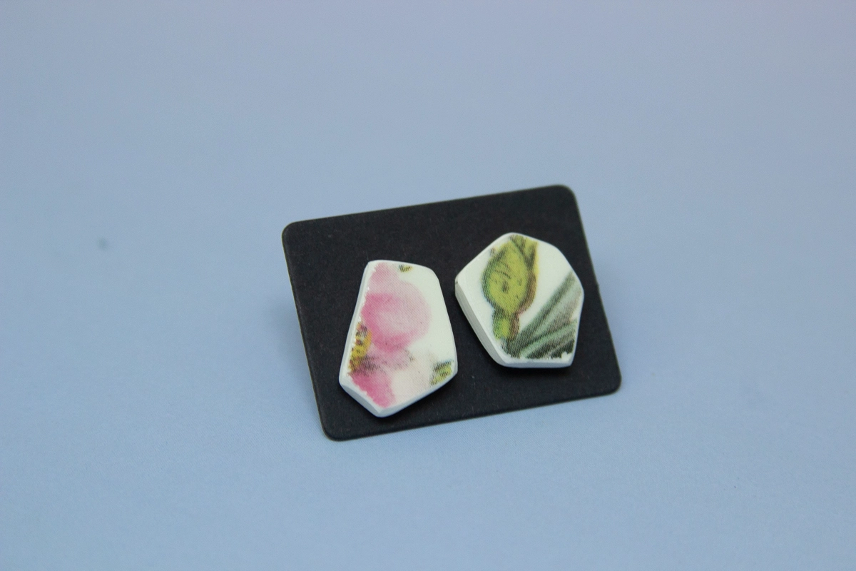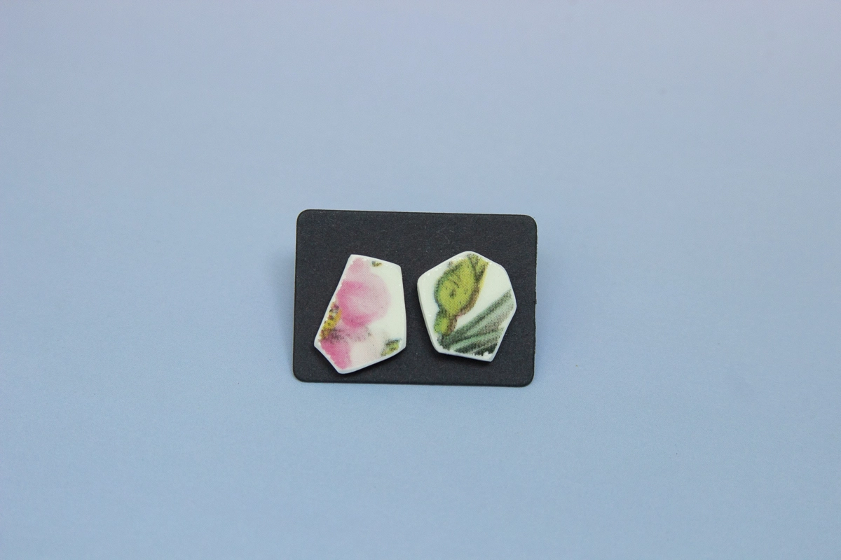 Earrings made from shards of a London plate.